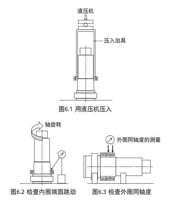 通過手動壓力機等壓入軸承時,首先需要計算根據軸和內圈之間的過盈產生的壓入力(必須采用工作壓力大于所需壓力的液壓機)。然后,在壓入內圈時,應使用內圈壓入工具,確實將其壓入軸肩(請勿向外圈加力)。壓入后,測量軸承各部位的精度,確認是否確實安裝在軸上。另外,組配使用多列軸承時,在組裝后應測量其跳動,修正外圈間的軸心偏差。