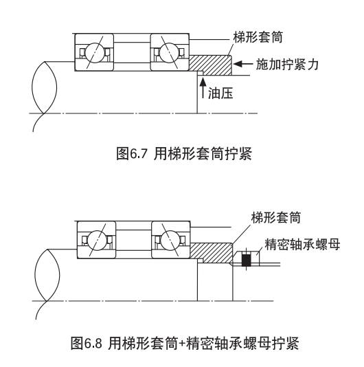 梯形套筒將因油壓而膨脹的套筒插到軸上,施加所需的壓入力(擰緊力)后,除去油壓,在將套筒固定在軸上的同時向軸承施加抒緊力,是一種比較容易的固定方法。