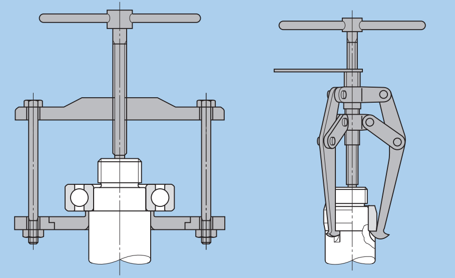 對于小型軸承,可采用如上圖所示的拉拔夾具將軸承拉出,但如果能夠采用如下圖所示的專業(yè)拆卸夾具,以壓出的方法壓出軸承,則更佳,下圖的工具,不僅不會損壞軸承,而且工作效率也更高。