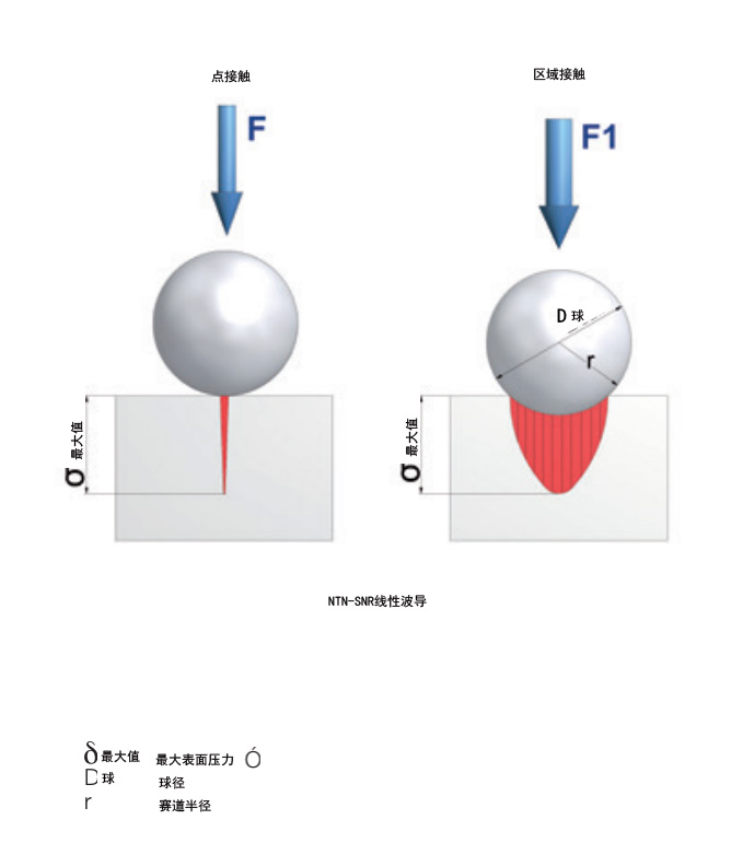 當(dāng)球在某一點接觸平面時,會產(chǎn)生高表面壓力(如下圖)。現(xiàn)代線性導(dǎo)軌中的凹槽具有一定的半徑,以增加接觸面積。賽道半徑與球直徑之比(以百分比表示)稱為緊密度。這顯著提高了球的承載能力、使用壽命和剛性,以實現(xiàn)表面壓力相等。