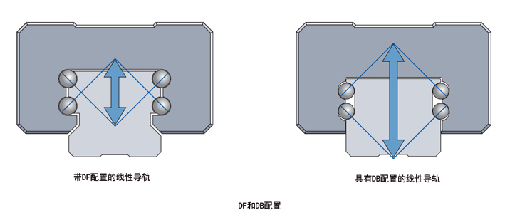 道配置是線性導(dǎo)軌的另一個特點。使用以下替代方案:座圈的DF配置和DB配置,對應(yīng)于滾柱軸承系統(tǒng)使用的術(shù)語(如下圖)。