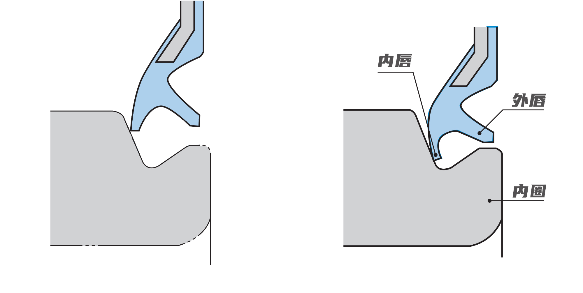 三是LLU型(接觸密封型),密封圈由合成橡膠制成,模制在外圈上,密封圈受力,便密封圈與內圈產生緊密接觸,如上圖所示,將左側密封圈下壓,使之產生扭曲變形,成為右圖式接觸型密封。