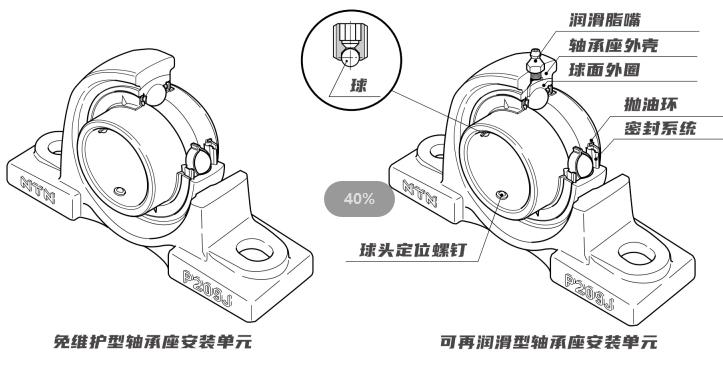 一、球頭定位螺釘。NTN獨特的球頭定位螺釘用于緊定軸承單元,即使在承受振動或沖擊載荷時,也能將軸承單元可靠地鎖定在軸上。