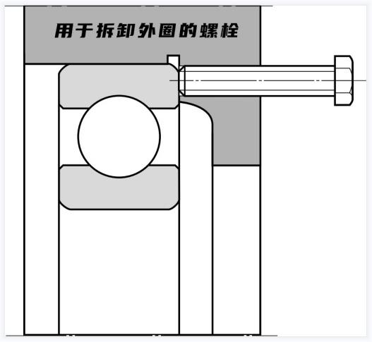 圓柱孔軸承的拆卸如上圖及下圖所示,通常使用壓力機(jī)或拉拔器來拆卸小軸承,設(shè)計還必須考慮到拆卸,如下圖所示,長時間使用的大型過盈配合軸承的拆卸需要較大的負(fù)載,此類軸承應(yīng)設(shè)計為通過液壓方式拆卸,除此外,電感加熱器可用于拆卸具有可分離內(nèi)圈和外圈的圓柱滾子軸承。