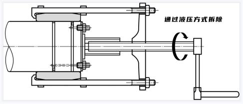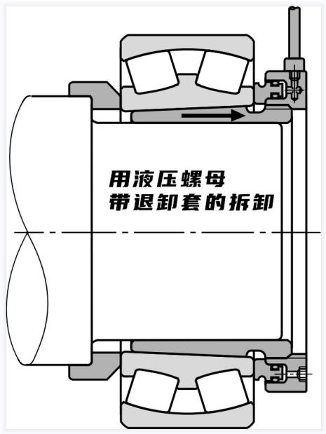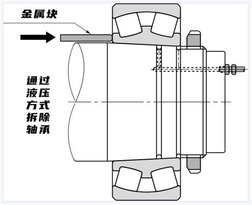 錐形孔軸承的拆卸如下圖所示,通過擰松緊固螺母,在內(nèi)圈上放置一個金屬塊,并用錘子敲擊,拆下使用適配器套筒安裝的小軸承,通過使用液壓拆卸方式,可以方便地使用適配器套筒或拆卸套筒拆卸安裝在錐形軸上的大型軸承。
