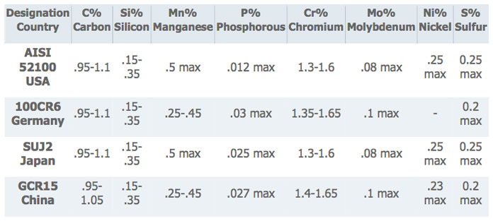 超凈52100鉻鋼是一種優秀的通用軸承鋼,由于其優異的硬度和耐磨性,由此制成的滾動軸承具有良好的疲勞壽命,然而,由于鉻含量低,鉻鋼的耐腐蝕性較差,軸承表面必須涂上防銹劑或油以防止氧化,下表是在不同國家生產的軸承鉻鋼標準化學成分,以供參考。