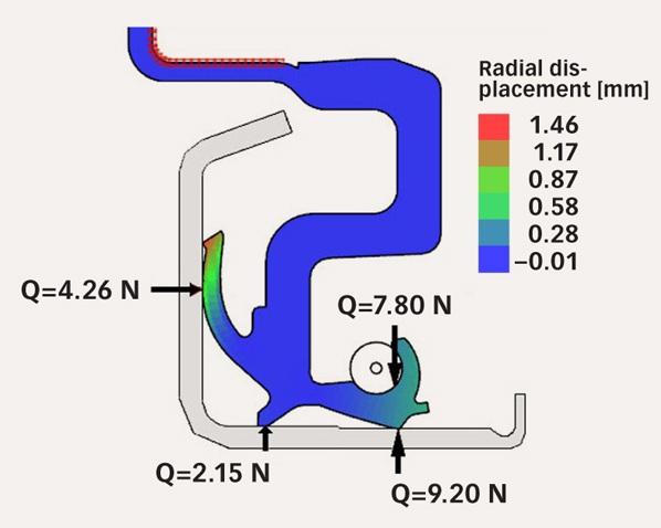 計算安裝在軸上的密封件的能力是一個附加功能,當安裝密封件時,它會在反表面上施加一個力,稱為唇緣力,唇緣力是密封件在靜態(tài)和動態(tài)操作條件下最重要的參數(shù)之一,唇緣力可確保所需的密封性,但也會導(dǎo)致唇緣下的密封摩擦,此外,當密封材料老化時,可以使用彈簧來保持足夠的密封唇力。因此,準確預(yù)測不同操作條件下的唇緣力是模擬工具的關(guān)鍵要求,這將有助于減少設(shè)計迭代次數(shù),從而縮短新產(chǎn)品的上市時間。