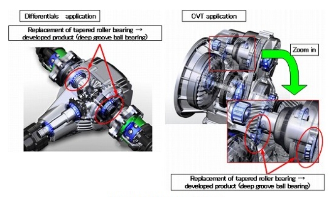 鑒于此,NTN公司開發(fā)了“用于高推力載荷的深溝球軸承”,將推力載荷(沿軸旋轉(zhuǎn)方向作用的載荷,對應(yīng)的徑向載荷是垂直于旋轉(zhuǎn)軸作用的載荷)提升了三倍,并且能夠取代車輛差速器(汽車等帶輪機(jī)器中使用的動力傳動裝置,該裝置在汽車轉(zhuǎn)彎時吸收內(nèi)外輪之間的速度差,同時分配發(fā)動機(jī)提供的相同扭矩)和變速器中使用的圓錐滾子軸承。
