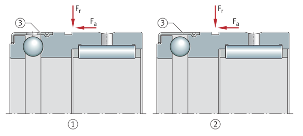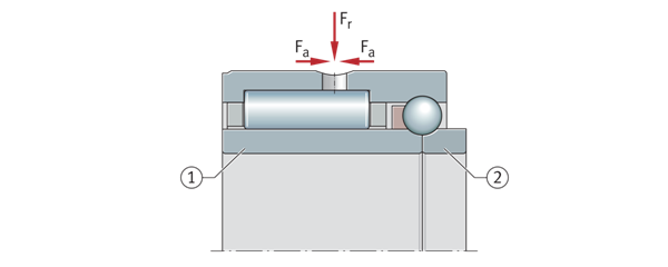 組合滾針軸承/滾針軸承: 荷載方向比較 Fr=徑向載荷 Fa=軸向載荷 ①滾針/軸向深溝球軸承NKX ②滾針軸承NK | ![]() |