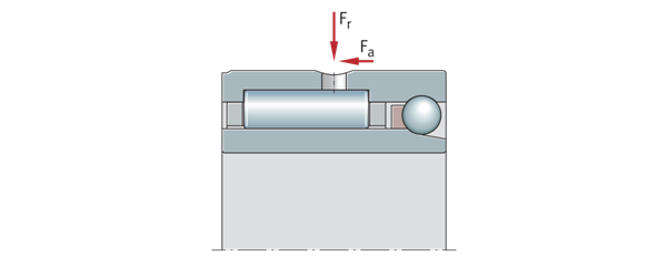 在動態(tài)載荷下確定軸承尺寸時使用的基本額定壽命方程L=(C/P)P假定了恒定大小和方向的同心作用載荷。在徑向軸承的情況下,這是一個純徑向載荷Fr,而在軸向軸承的情況中,這是純軸向載荷Fa。為了計算組合滾針軸承的疲勞額定壽命,在P的額定壽命中使用軸承載荷Fr或Fa(Pr=Fr或Pa=Fa)