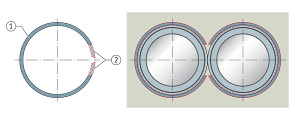 NKX和NKXR相鄰結(jié)構(gòu)中的自由外殼定位墊圈 D1=不帶端蓋的殼體定位墊圈的尺寸 D2=帶端蓋的殼體定位墊圈的尺寸 | ![]() |