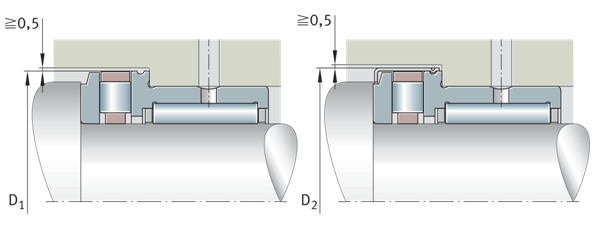 為了避免雙重配合,相鄰結(jié)構(gòu)中外殼定位墊圈的接觸面直徑必須至少比軸承NKX和NKXR中軸承墊圈的尺寸D1和D2大+0.5 mm