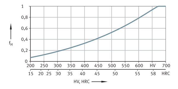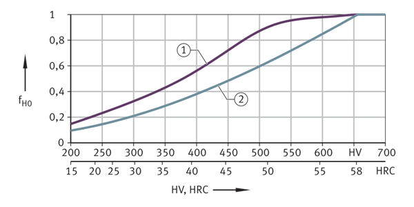 如果滾道滿足滾動軸承材料的要求,但滾道硬度小于670 HV,則軸承布置上的載荷較小。為了確定軸承裝置的動態(tài)和靜態(tài)承載能力,軸承的基本動態(tài)額定載荷C必須乘以折減系數(shù)fH(動態(tài)硬度系數(shù)),基本靜態(tài)額定載荷C0r乘以折減因子fH0(靜態(tài)硬度系數(shù))
