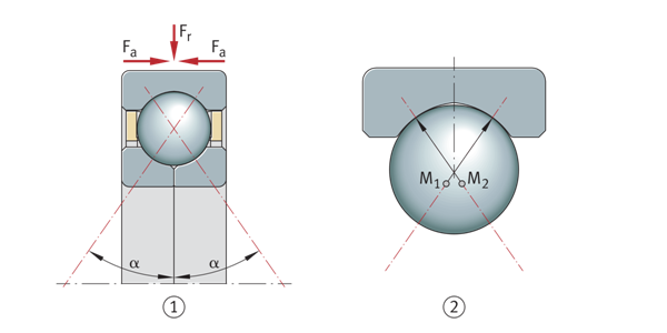 基本設計的四點接觸球軸承 α=標稱接觸角 M1,M2=外圈滾道的曲率中心 Fr=徑向載荷 Fa=軸向載荷 四點接觸球軸承,剖分式內圈,外圈沒有固定槽 | ![]() |