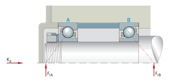 調整后的軸承布置 具有兩個X形排列的單列角接觸球軸承,外力 Ka=作用在軸承上的外部軸向力 FrA=徑向載荷,軸承A FrB=徑向載荷,軸承B | ![]() |