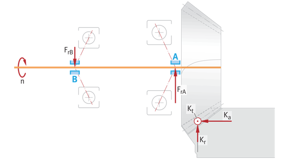 軸承A承受徑向載荷FrA,軸承B承受徑向載荷FrB,FrA和FrB作用于軸承的中心壓力點(產品表中的尺寸a),并且始終被視為正。