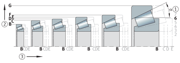符合ISO 355的圓錐滾子軸承的尺寸計(jì)劃(摘錄) ①接觸角系列(接觸角范圍) ②直徑系列 ③寬度系列 | ![]() |