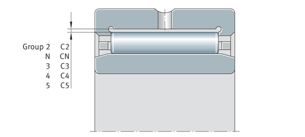 徑向內(nèi)部游隙組在DIN 620-4和ISO 5753-1中定義,并在DIN 620-3中通過(guò)包括大寫(xiě)字母C和數(shù)字的代碼進(jìn)行描述。ISO 5753-1通過(guò)單詞“組”和數(shù)字來(lái)指定。
