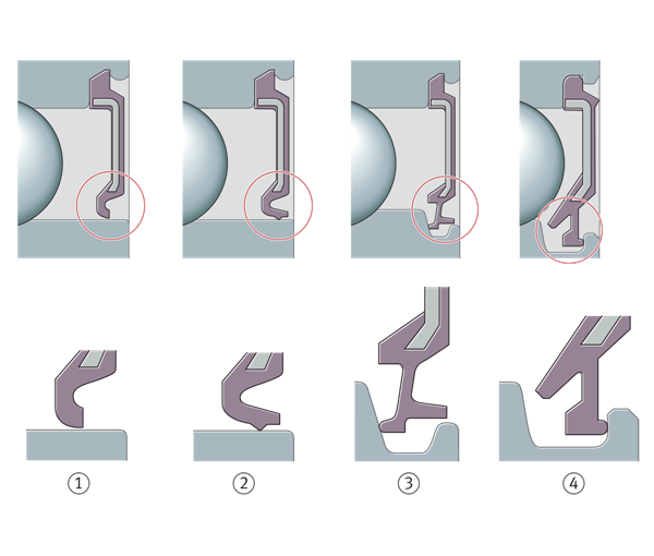 帶彈性密封唇的密封墊圈 ①密封墊圈RSD ②密封墊圈RSR ③用于軸向向內密封的密封墊圈,帶有額外的外部密封唇 ④軸向向外密封的密封墊圈 | ![]() |