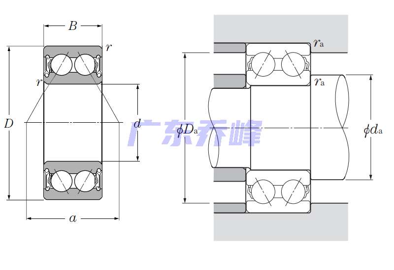| 雙列角接觸球軸承 - 雙面密封(非接觸式橡膠密封) - 尺寸 | |