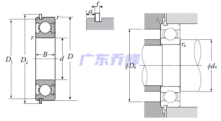 | 單列深溝球軸承 - 單面密封(接觸式橡膠密封)帶止動(dòng)環(huán) - 尺寸 | |