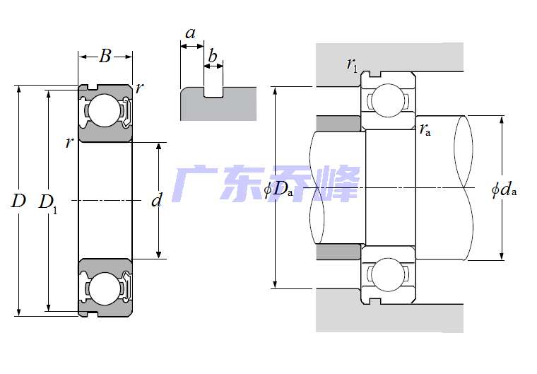 單列深溝球軸承 - 單面密封(非接觸式橡膠密封)帶止動(dòng)環(huán)槽 - 尺寸