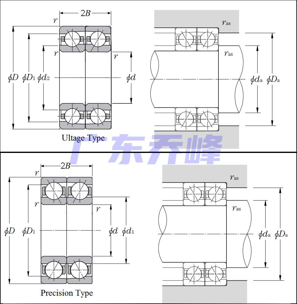 雙聯角接觸球軸承 - 面對面配對 - 尺寸