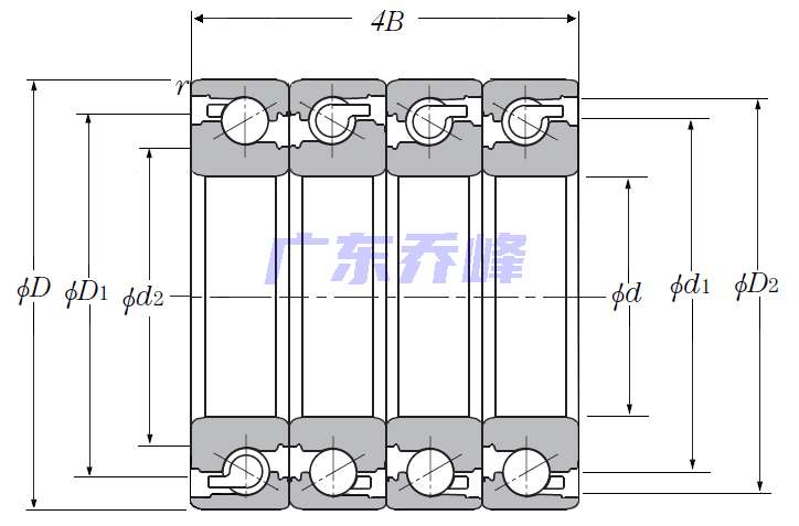 | 滾珠絲杠用四列角接觸推力球軸承 - DBTT配對,開式,三排承受軸向載荷 - 尺寸 | |