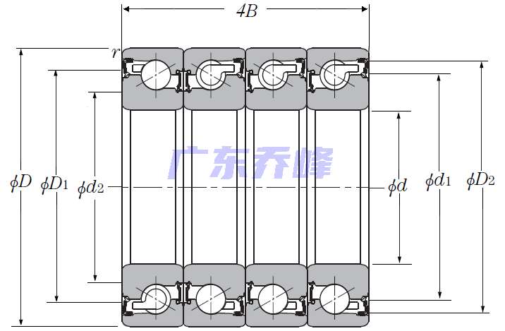 | 滾珠絲杠用四列角接觸推力球軸承 - DBTT配對,雙面密封,三排承受軸向載荷 - 尺寸 | |