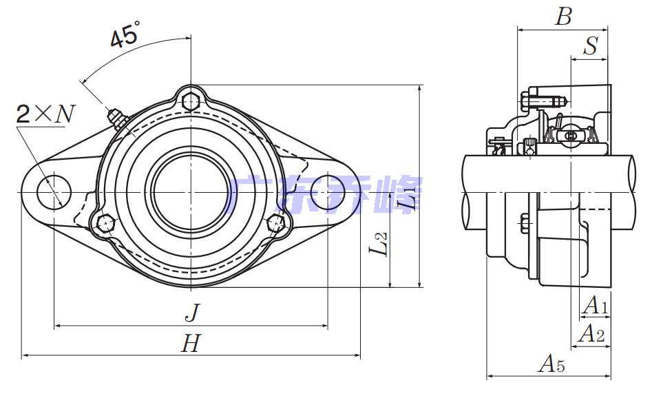 軸承型號:C-UCFL316D1,雙螺栓菱形法蘭式軸承座單元,鑄造外殼,帶緊定螺釘,鑄造防塵蓋,開式端蓋,UCFL型