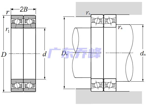 | 超高速雙聯角接觸球軸承,背對背配對 - 尺寸 | |