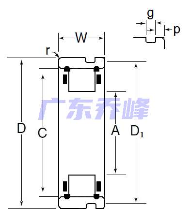 | 帶保持架和滾子的外圈,兩個擋圈&帶止動環(huán)槽 in外圈 O.D. - 尺寸 | |