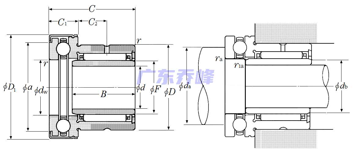 帶推力球軸承的滾針組合軸承 -帶內圈&端蓋 - 尺寸